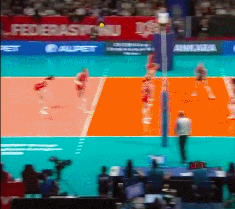 尽管科内利亚诺防守起球,但却将球垫到场外。西拉狂奔到场外将球捞回。而朱婷背对球网,飞身直接将球垫过网。